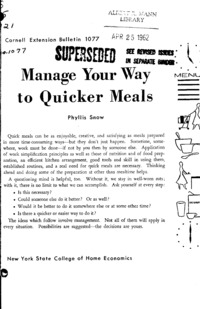 Number 1077 - Manage Your Way to Quicker Meals: Cornell extension bulletin